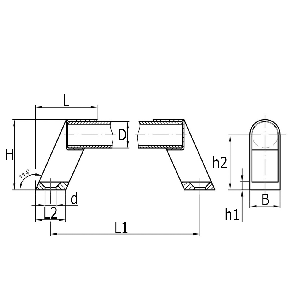 B=Breite, D=Rohr-Ø, d=Bohrung-Ø, H=Höhe, h1=Höhe, h2=Höhe, L=Länge Endstück, L1=Abstand zwischen Bohrungsmitten +/-1mm, L2=Länge