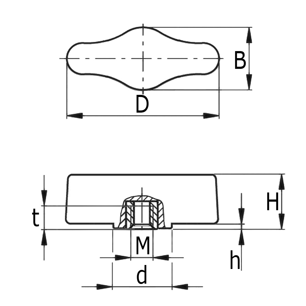 - Kunststoff-Flügelmuttern mit Metall-Gewindebuchse (Sackloch) sind lieferbar in Innengewindemaßen von M4 bis M6