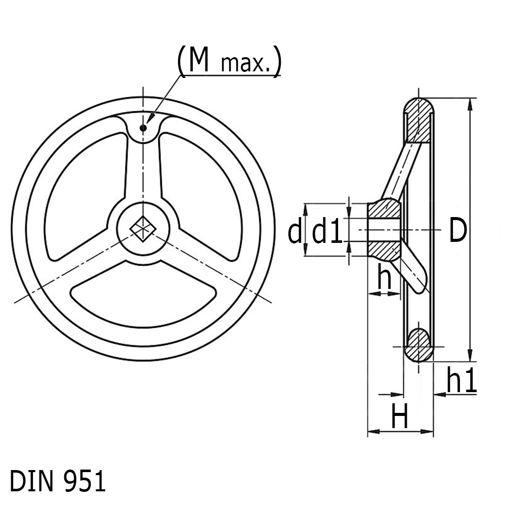 Bohrung=Bohrungsmaß, D=Radkranz-Ø, d=Nabe-Ø, DIN=DIN Ausführung, H=Total-Höhe, h=Nabenhöhe, h1=Radkranz Höhe, M=maximales Gewindemaß für optionellem Griff (Position nur vorcentriert)