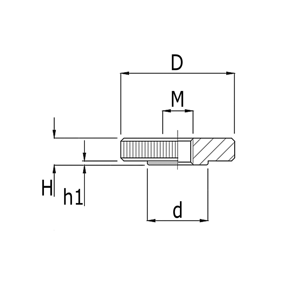 D=Knopf-Ø, d=Bund-Ø, H=Knopfhöhe, H1=Gesammthöhe, h1=Bundhöhe, M=Gewindemaß