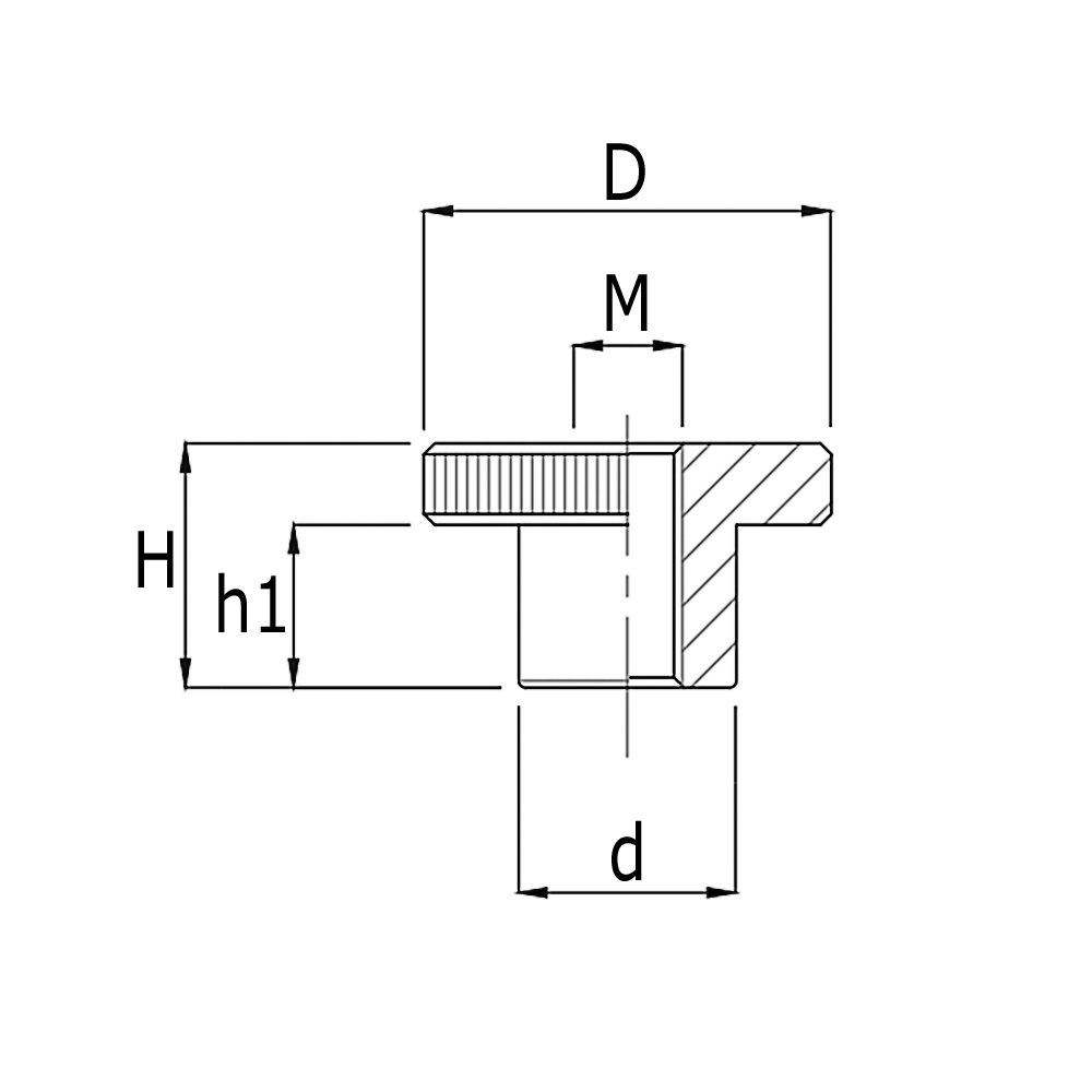 D=Knopf-Ø, d=Bund-Ø, H=Knopfhöhe, H1=Gesammthöhe, h1=Bundhöhe, M=Gewindemaß