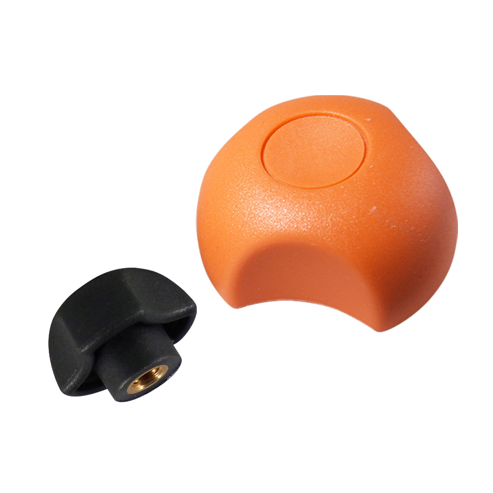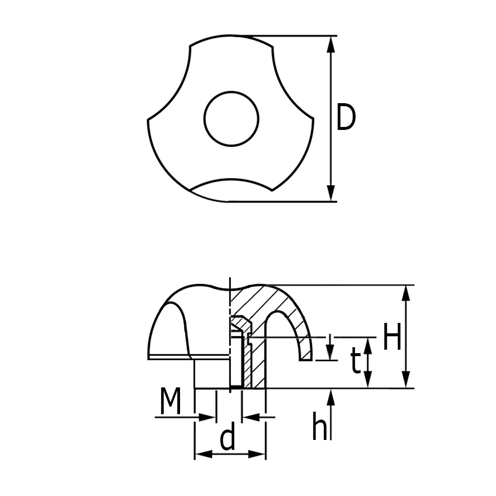 D=Knopf-Ø, d=Nabe-Ø, H=Höhe, h=Höhe, M=Gewindemaß, t=Länge Gewindebuchse