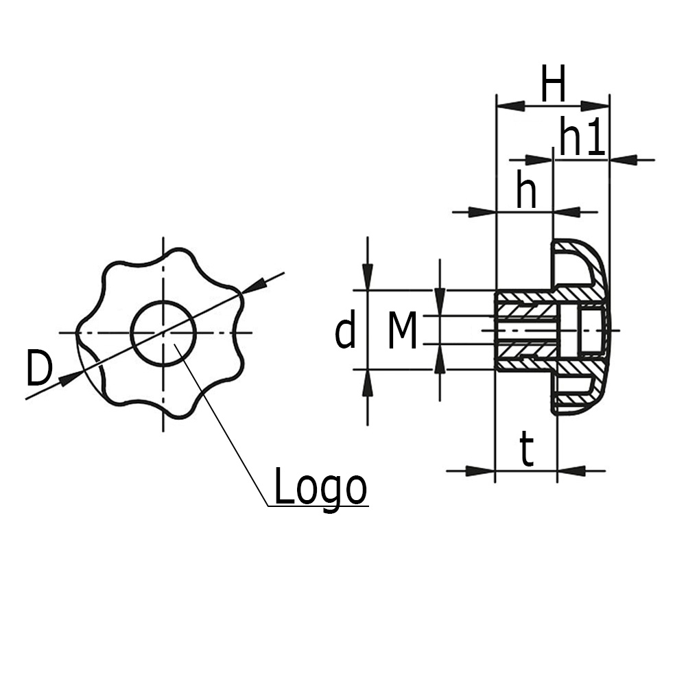 D=Knopf-Ø, d=Nabe-Ø, H=Totalhöhe, h=Höhe, h1=Höhe, M=Gewinde, t=Gewinde Tiefe