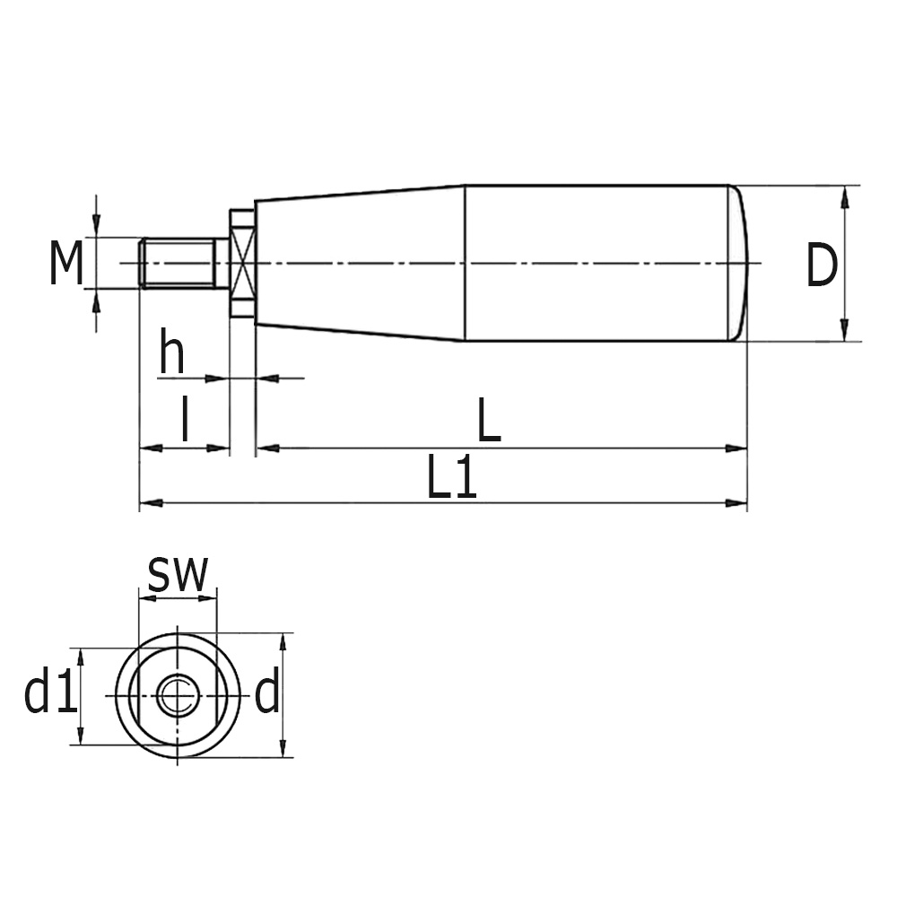 D=Griff-Ø-groß, d=Griff-Ø-klein, L=Grifflänge, L1= Total Länge, l=Gewindelänge, M=Gewindemaß, SW=Schlüsselweite