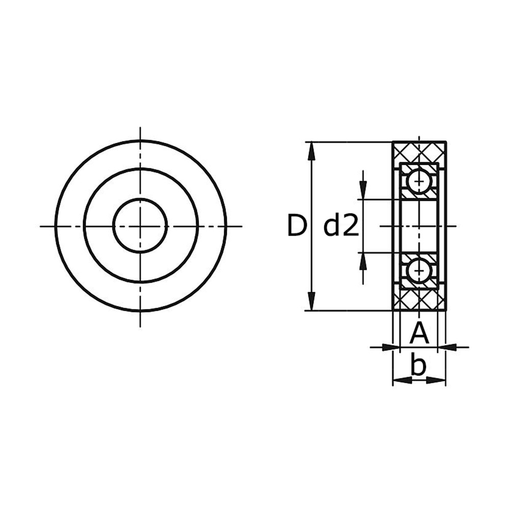 A=Nabenbreite, B=Breite Lauffläche, D=Ø-Rad, d2=Ø-Achsloch, K=Maximale zulässige Tragfähigkeit in kg