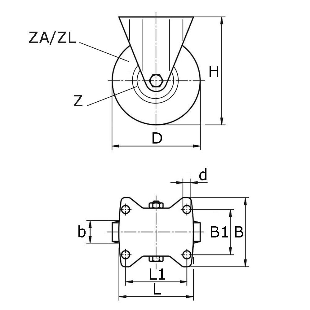 B=Breite Montageplatte, b=Reifenbreite in mm, B1=Abstand der Bohrungsmitten, D=Ø-Rad, d=Ø-Bohrung, H=Bauhöhe, K=Maximale zulässige statische Tragfähigkeit in kg bei 6 km/st, L=Länge Montageplatte, L1=Abstand der Bohrungsmitten, T=Ply-rating, Typ=Lagertyp, Z=Felgenmaße in mm (Ø x Breite), ZA=Reifenmaße in Inch