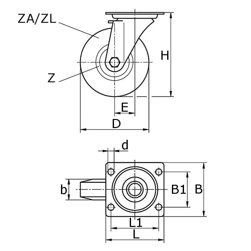 B=Breite Montageplatte, b=Reifenbreite in mm, B1=Abstand der Bohrungsmitten, D=Ø-Rad, d=Ø-Bohrung, E=Ausladung, H=Bauhöhe, K=Maximale zulässige statische Tragfähigkeit in kg bei 6 km/st, L=Länge Montageplatte, L1=Abstand der Bohrungsmitten, T=Ply-rating, Typ=Lagertyp, Z=Felgenmaße in mm (Ø x Breite), ZA=Reifenmaße in Inch