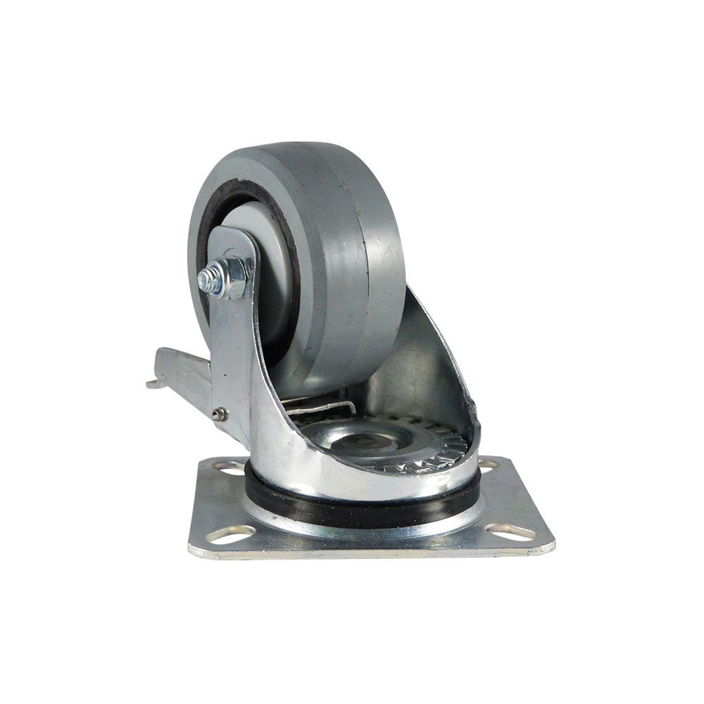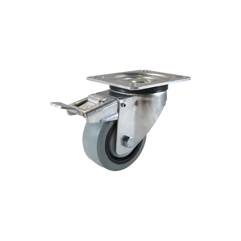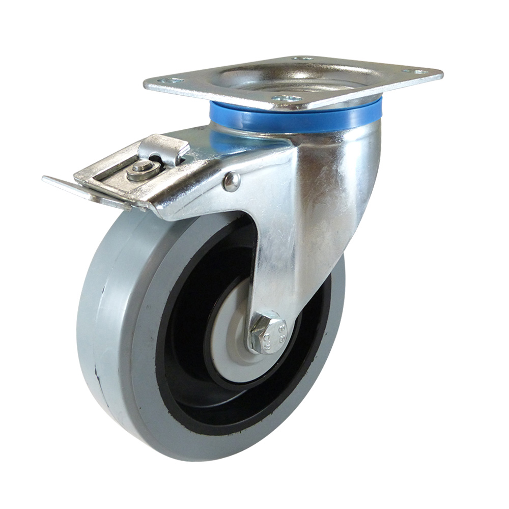 Lenkrol mit Bremse 125mm mit grau elastische Gummi Reife, mit Kunststof-Felge, mit Kugellager