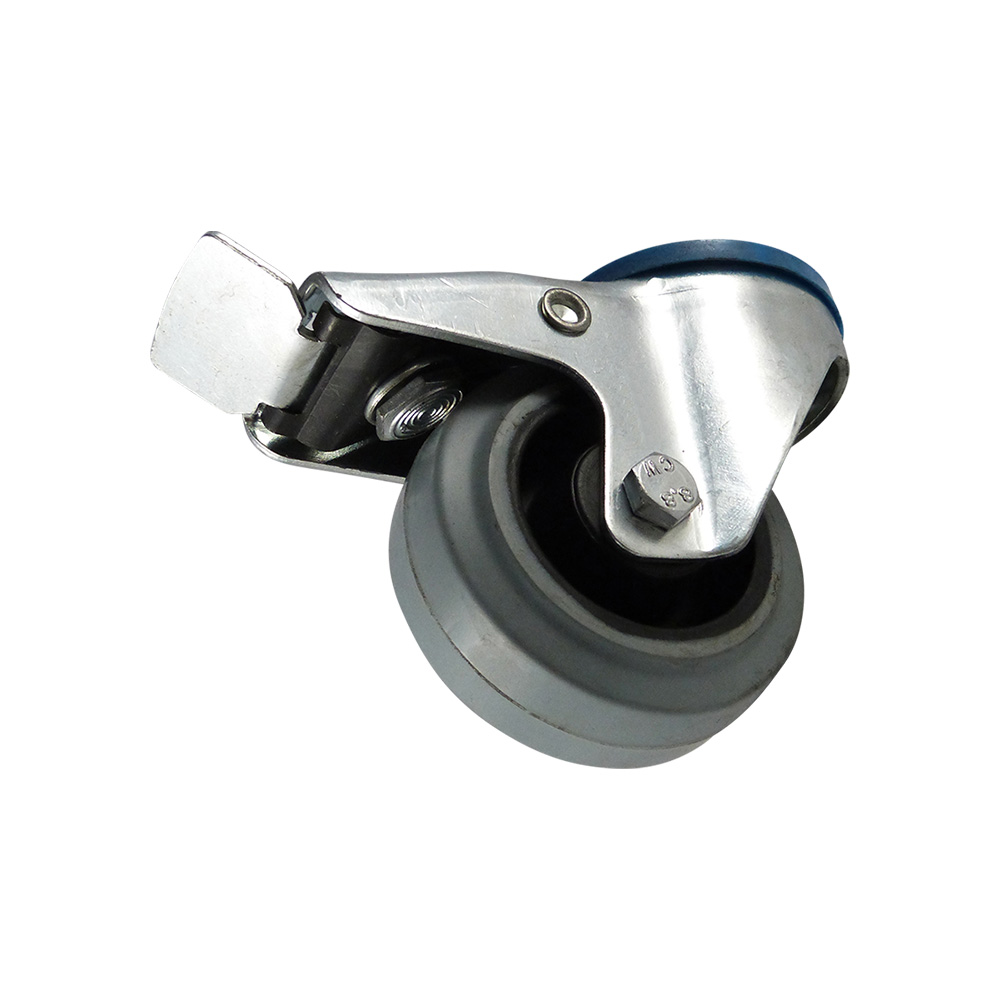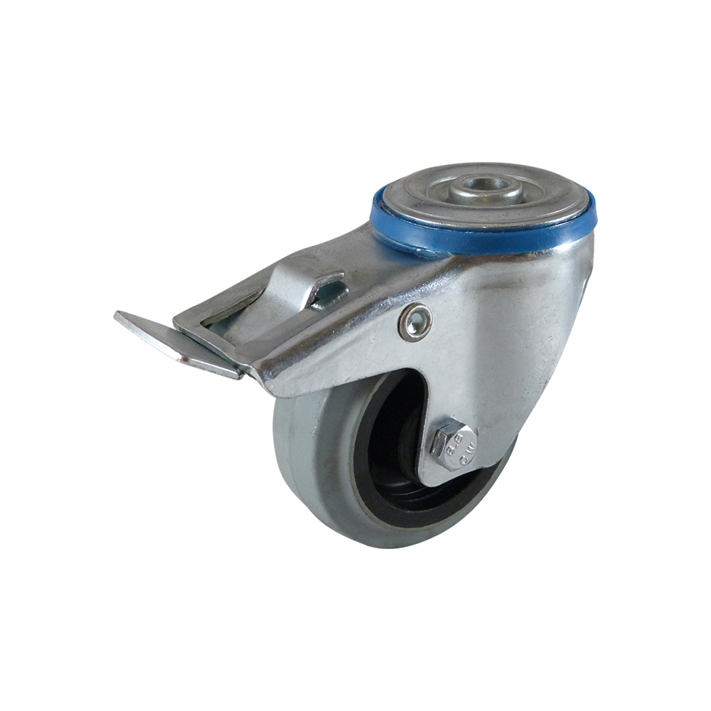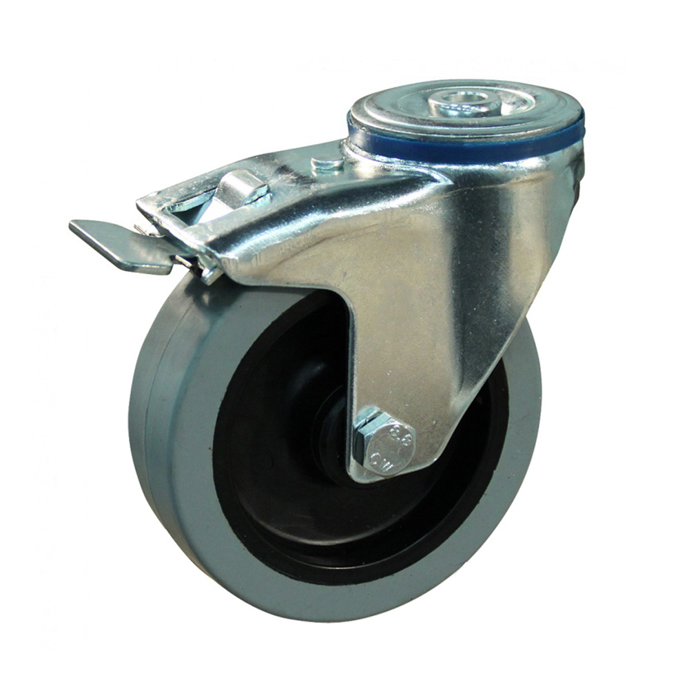 Lenkrolle Ø80mm mit graue elastische Gummi Reife auf Kunststof-Felge mit Rollenlager, mit Rückenloch