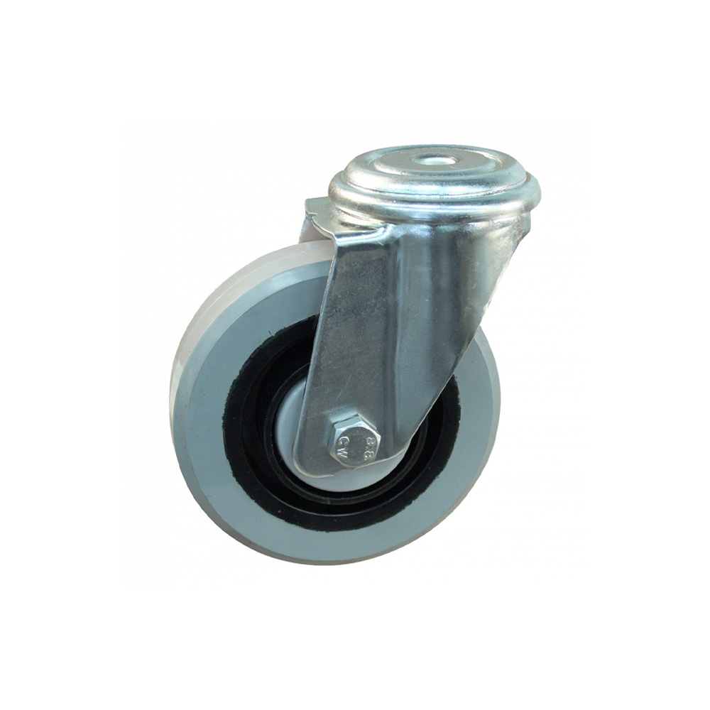 Lenkrolle Ø80mm mit grau elastische Gummi Reife auf Kunststof-Felge, mit Rollenlager mit Rückenloch
