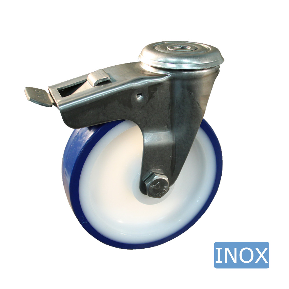 Edelstahl Lenkrolle Hygiene mit Bremse – Rückenloch – TPU Reifen