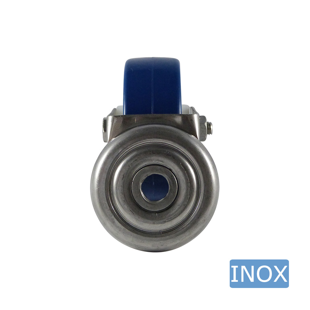 - Hygienische Lenkrollen aus Edelstahl mit blauem Reifen sind lieferbar in Rollendurchmessern von Ø80mm bis zu Ø150mm