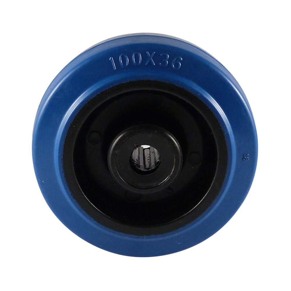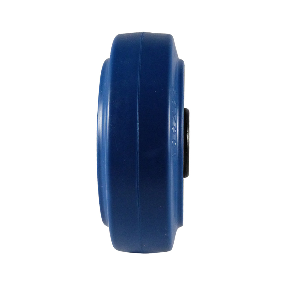 - Der aufvulkanisierte blaue Gummireifen (70° Shore A ±3°) ist stoßbeständig und hinterlässt keine Streifen (spurlos / non-marking).