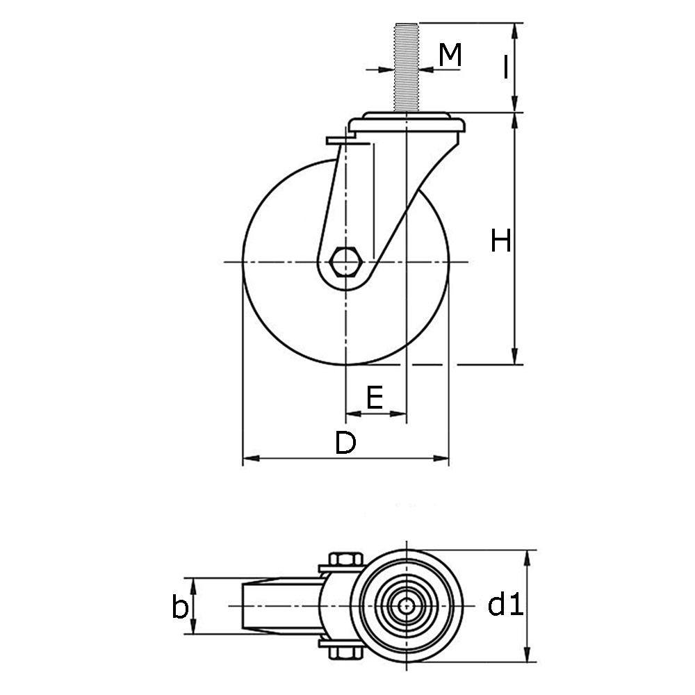 b=Breite Lauffläche, D=Ø-Rad, E=Ausladung, H=Bauhöhe, K=Maximale zulässige statische Tragfähigkeit in kg, l=Stiftlänge, M=Gewindemaß, Typ=Lagertyp