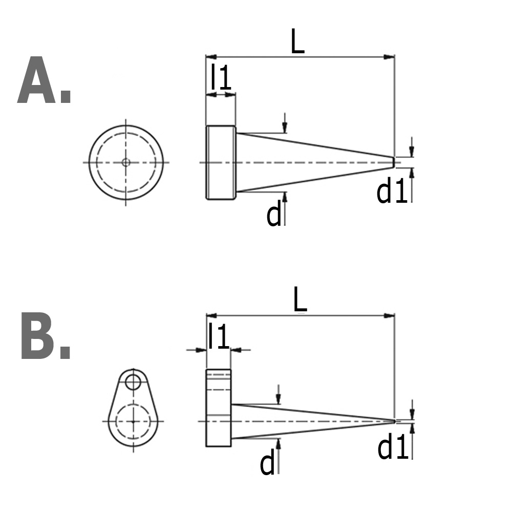 Bohrung=Passend für Locher ab Ø bis Ø, D=Größe-Ø, d=Kleine-Ø, L=Gesamtlänge, l1=Kopfhöhe