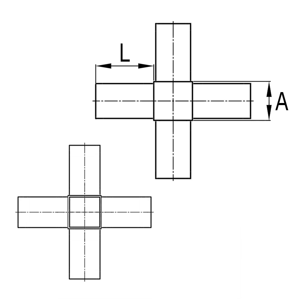 - Steckverbinder-Kreuz mit Abgang für Quadratrohre sind lieferbar für Rohrmaße von 20x20mm oder 25x25mm mit Wandstärken von 1,5mm oder 2,0mm