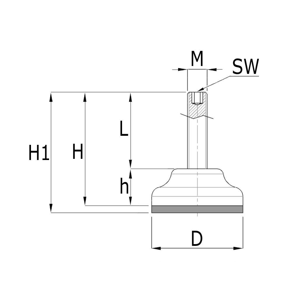 - StellMaschinenfüße mit drehbarem Kunststoff-Fuß, aber ohne Kugelgelenk, sind lieferbar mit stahlverzinkter Gewindespindel von M16 bis zu M30 mit Gewindelängen von 81mm bis zu 207mm