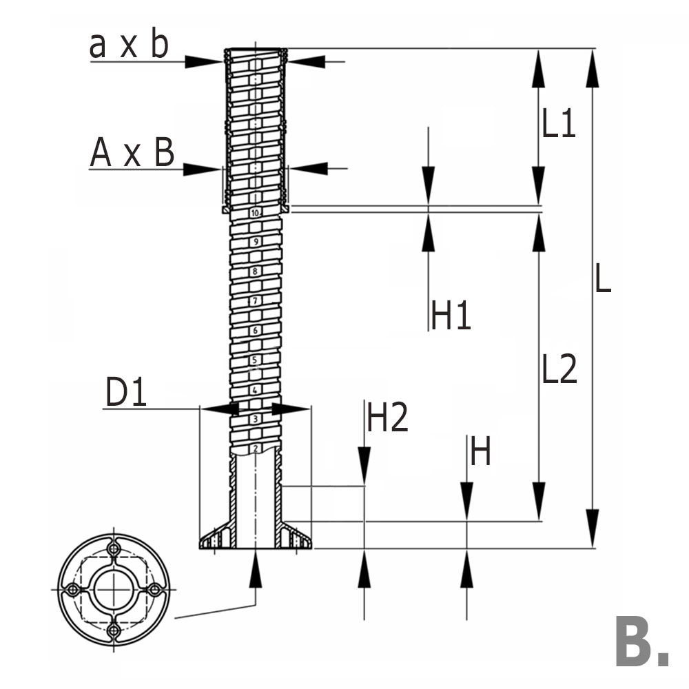 AxB=Bundmaße, axb=Lammellenmaße, Ausf.=Wandstärke, D1=Fuß-Ø, H=Fußhöhe, H1=Bundstärke, H2=Minimumhöhe bei eingedrehter Spindel, L=Totallänge, L1=Schaftlänge, L2=Verstellbereich, Rohrmaße=Rohraußenmaße