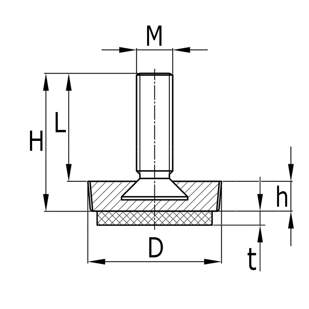 D=Fuß-Ø, H=Höhe Fuß, L=Nutzbare Gewindelänge, M=Gewindebolzen, t=Filzstarke