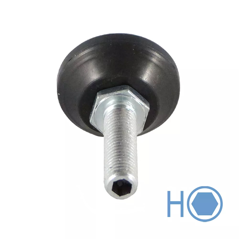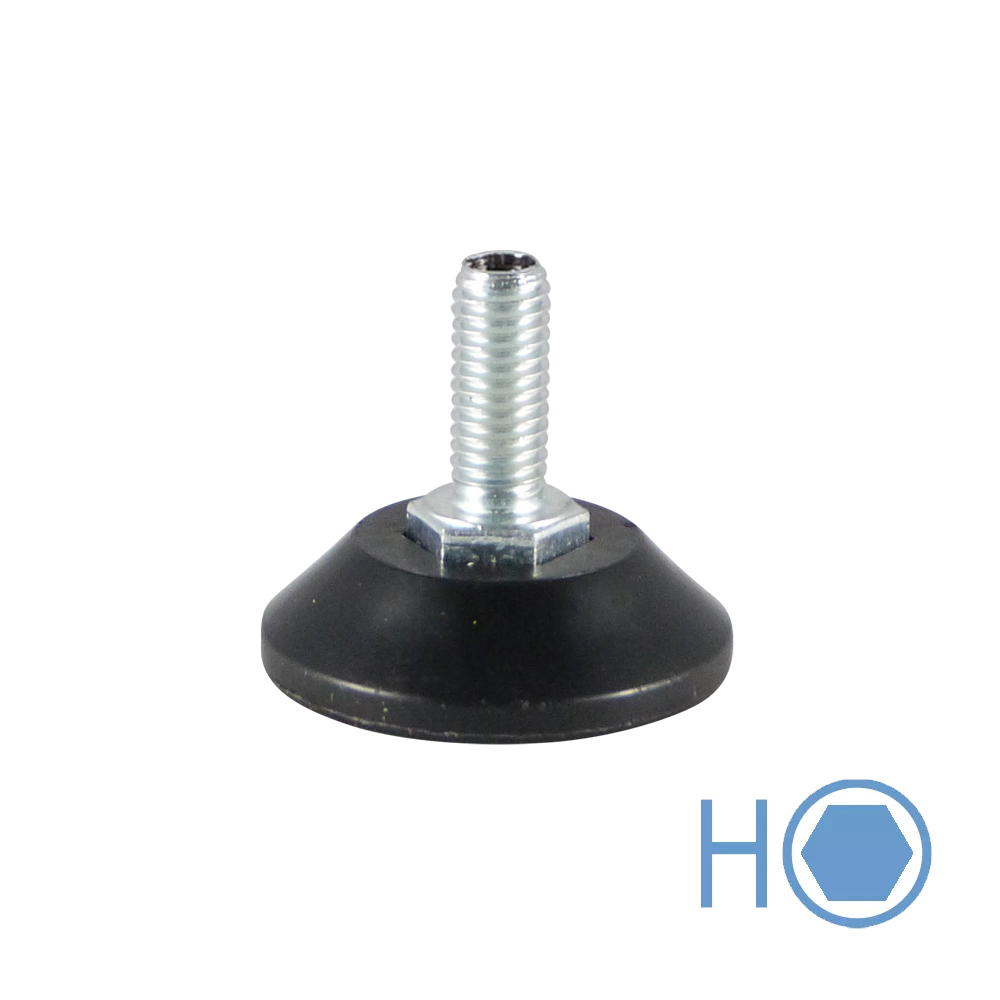 • Höhenversteller mit drehbarem konischem Fußteller sind lieferbar mit Gewindespindel die an der Oberseite mit einem Innensechskant (Inbus) versehen sind
