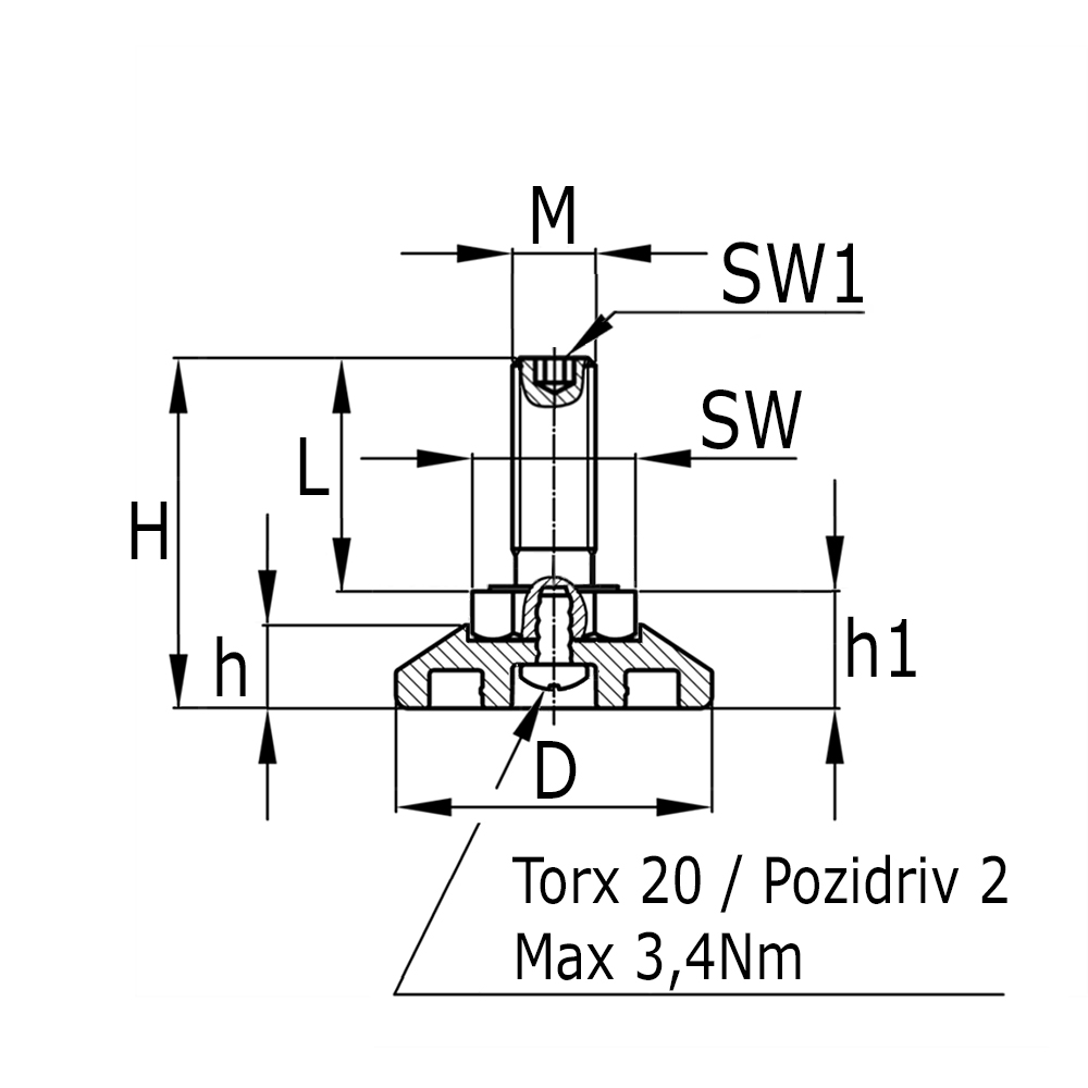 • Kreuzschlitz im Fußteller (Pozidrive 2 / Torx T20) zum einfachen maschinellen Eindrehen (max. Drehmoment 3,4Nm)