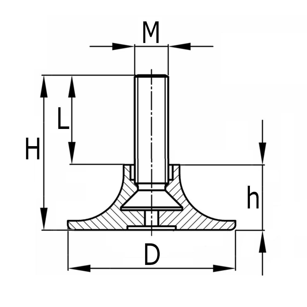 D=Fuß-Ø, d=Verjüngter Fuß-Ø, H=Fußhöhe L=Nutzbare Gewindelänge, M=Gewindebolzen