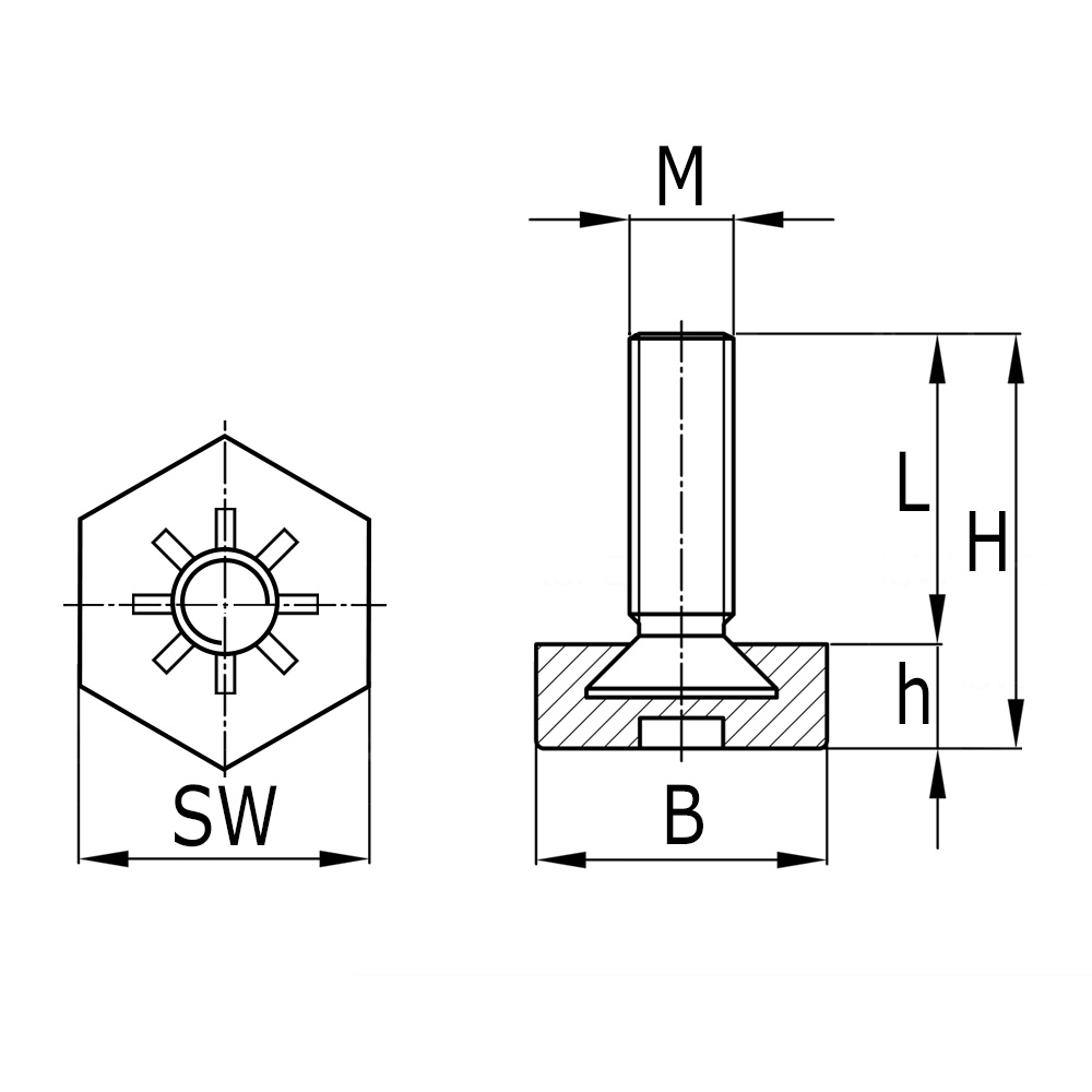 H=Höhe Fuß, L=Nutzbare Gewindelänge, M=Gewindebolzen, SW=Schlüsselweite