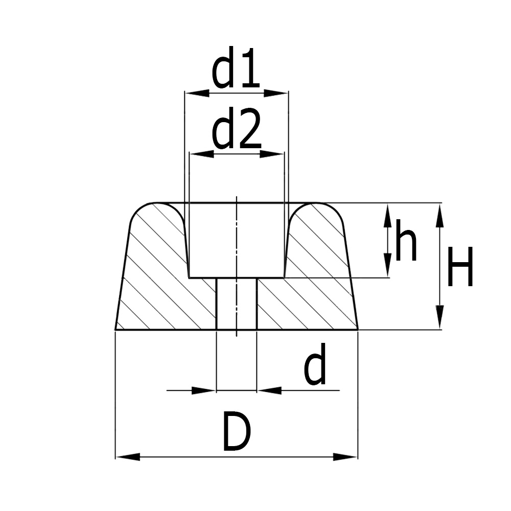 B=Senkloch-Ø groß, d=Tiefe des Senklochs, C=Senkloch-Ø klein, D=Durchmesser-Ø, b=Bohrung-Ø, H=Höhe
