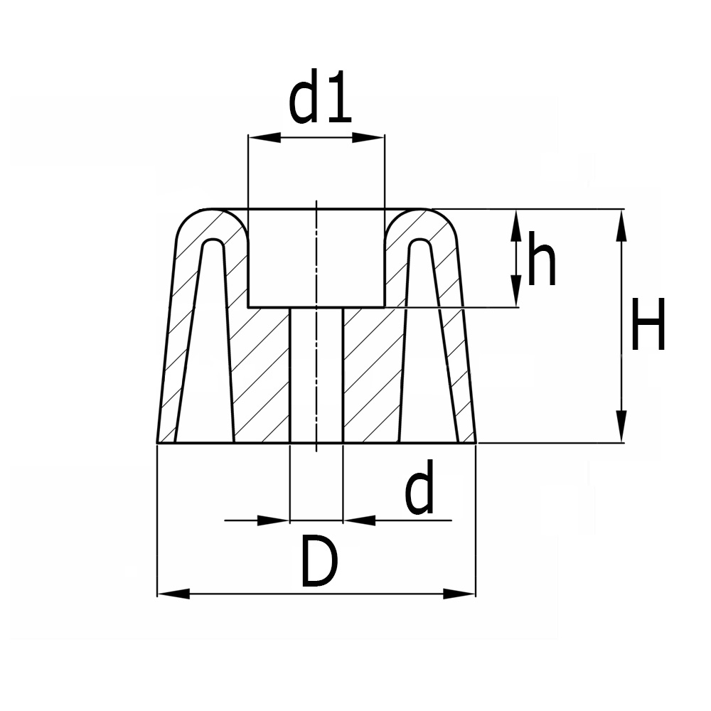 D=Außen-Ø, d=Bohrung-Ø, d1=Senkung-Ø, H=Höhe, h=Tiefe der Senkung