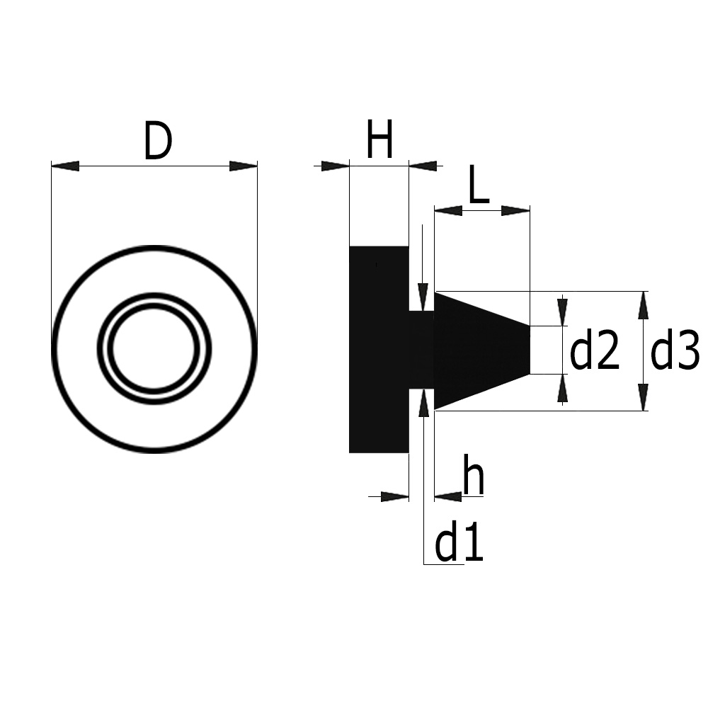 Ausf.=Model, D=Kopfdurchmesser, d1=Zapfen-Ø, d2=Zapfen-Ø, d3=Zapfen-Ø,h=Aussparungsmaß und Blechstärke, L=Zapfenlänge, L1=Kopfstärke