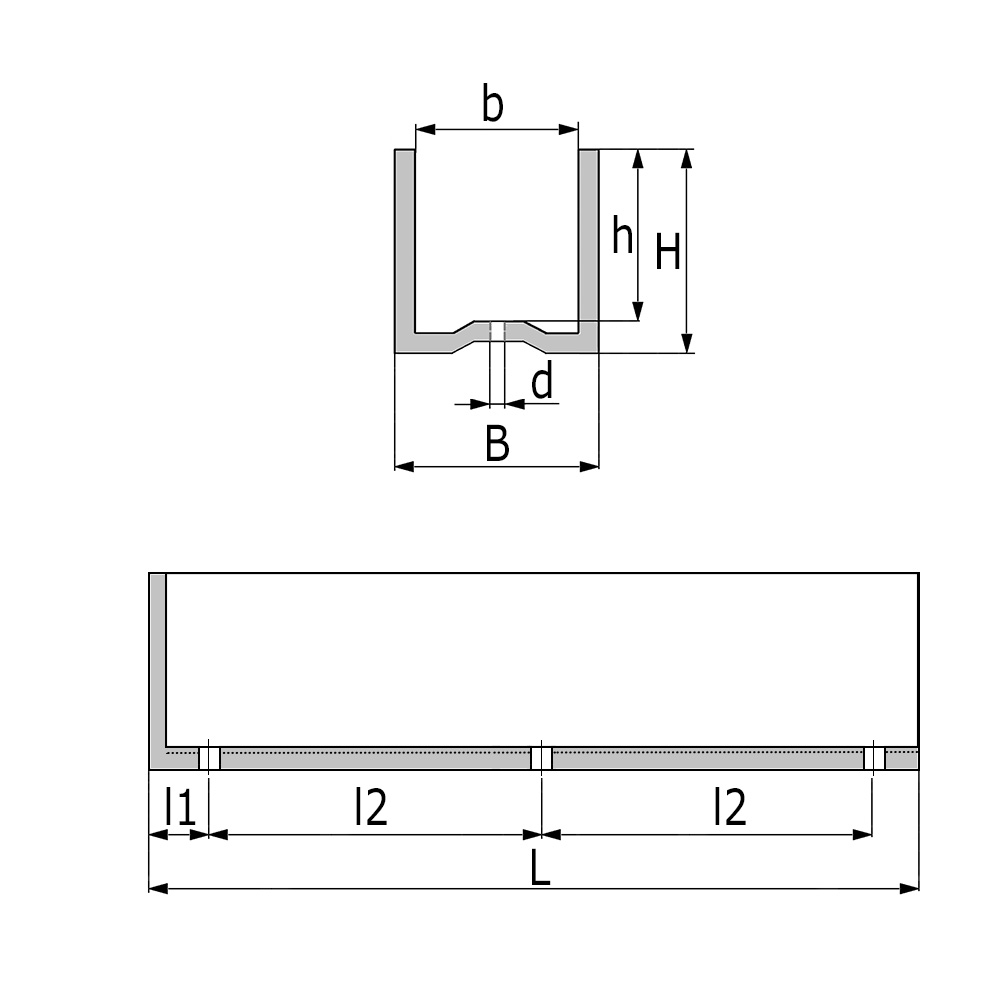 B=Breite aussen, b=Breite innen, d=Ø-Bohrung, H=Höhe außen, h=Höhe innen, L=Länge