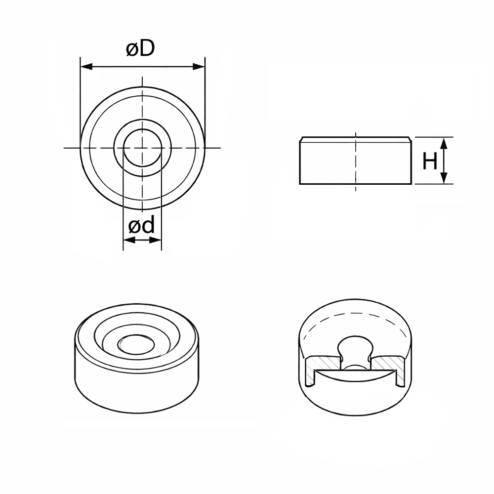 D=Außen-Ø, d=Innen-Ø für Schraubbefestigung, H=Höhe, Ausführung=Maximaler Spanndraht-Ø