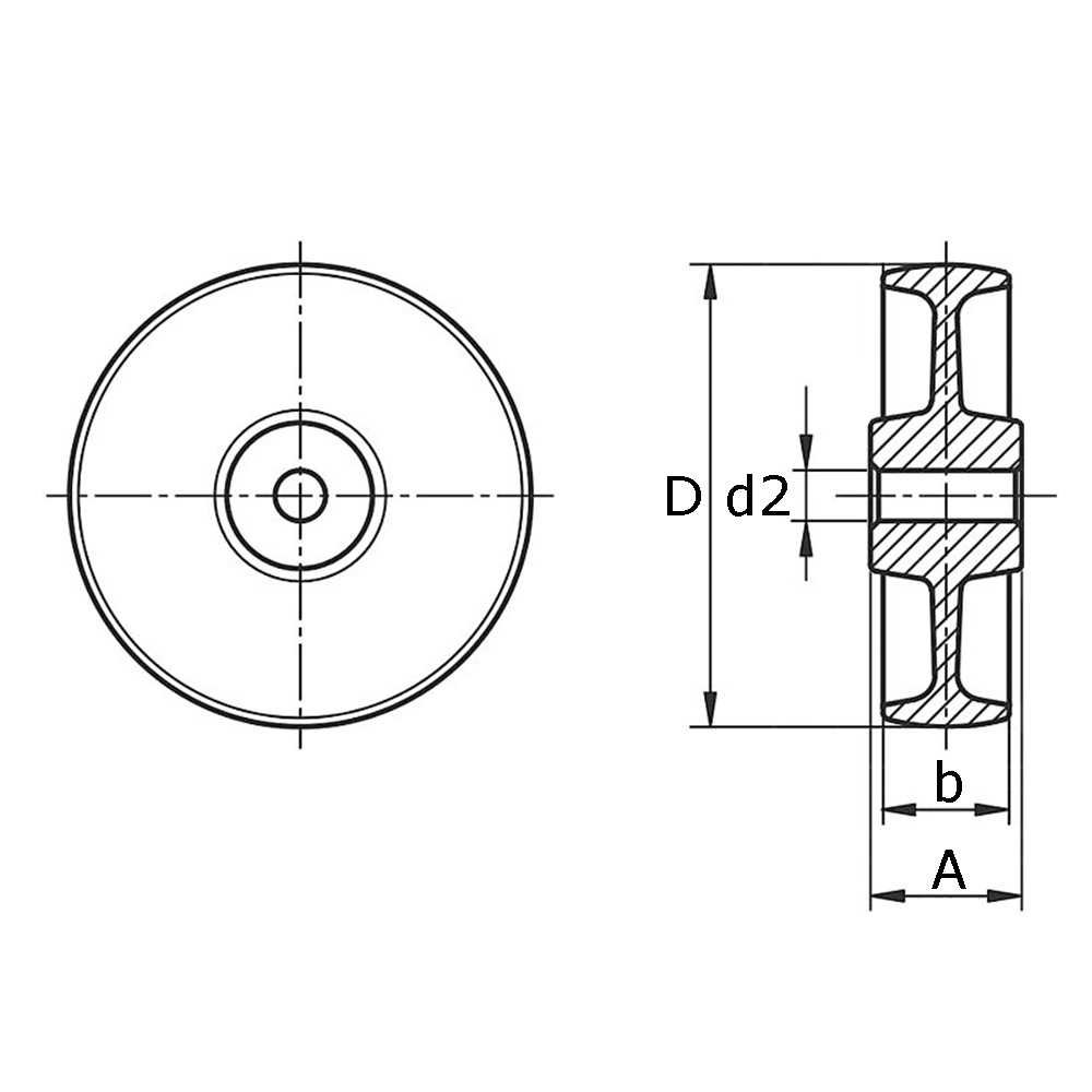 LegendeA=Nabenbreite, b=Breite Lauffläche, D=Ø-Bohrung, d=Achs-Ø, d2=Ø-Achsloch, K= Maximale zulässige statische Tragfähigkeit in kg, Rohrmaß=Geeignet für Rohr Außen-Ø, Typ=Lagertyp